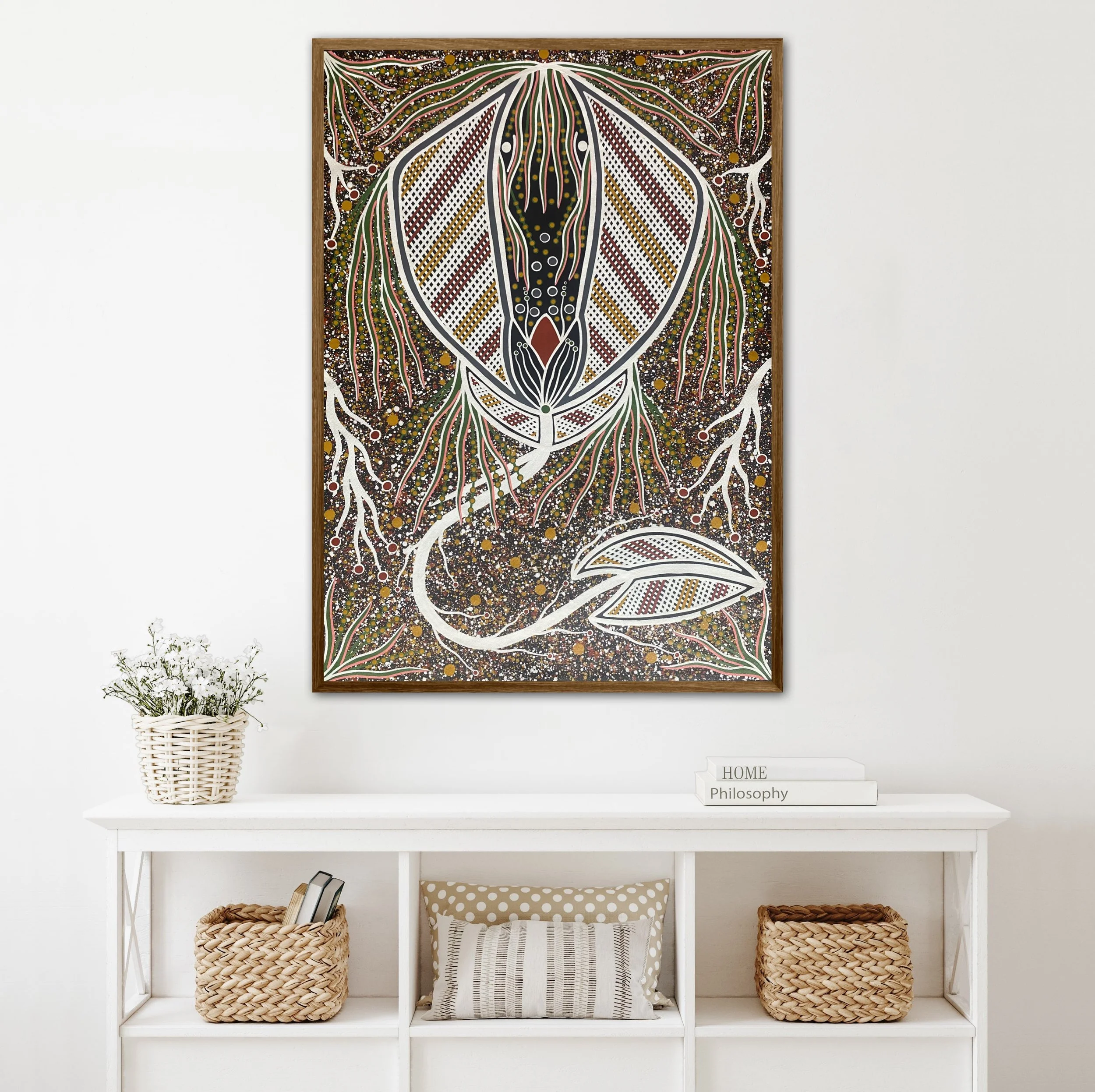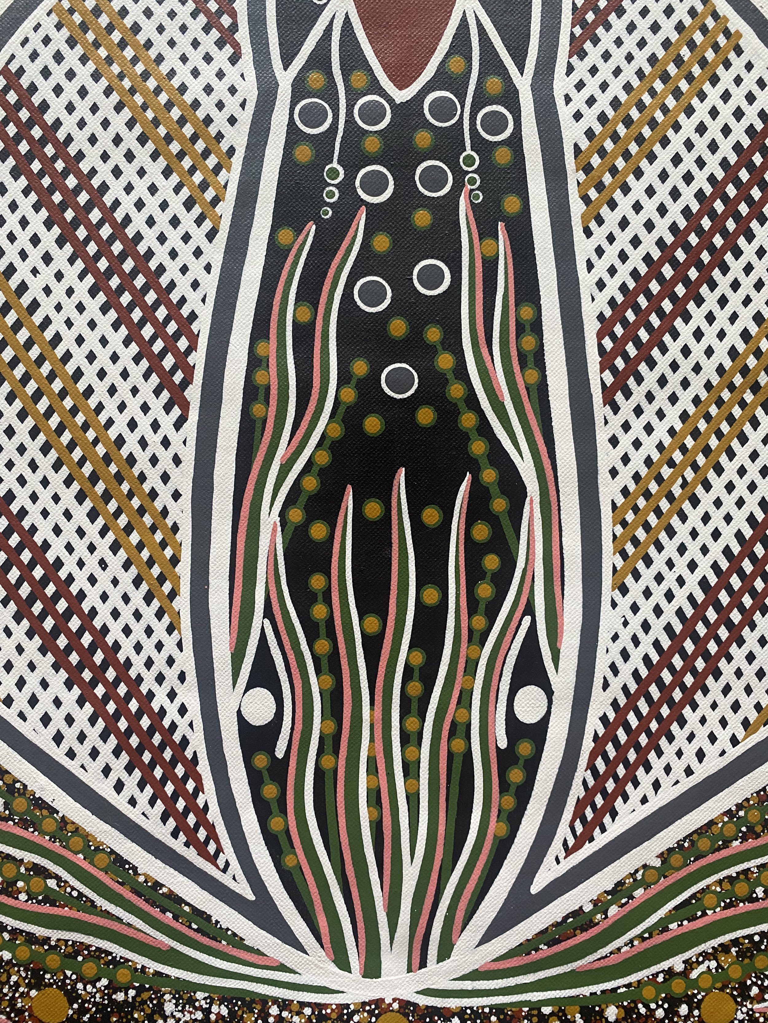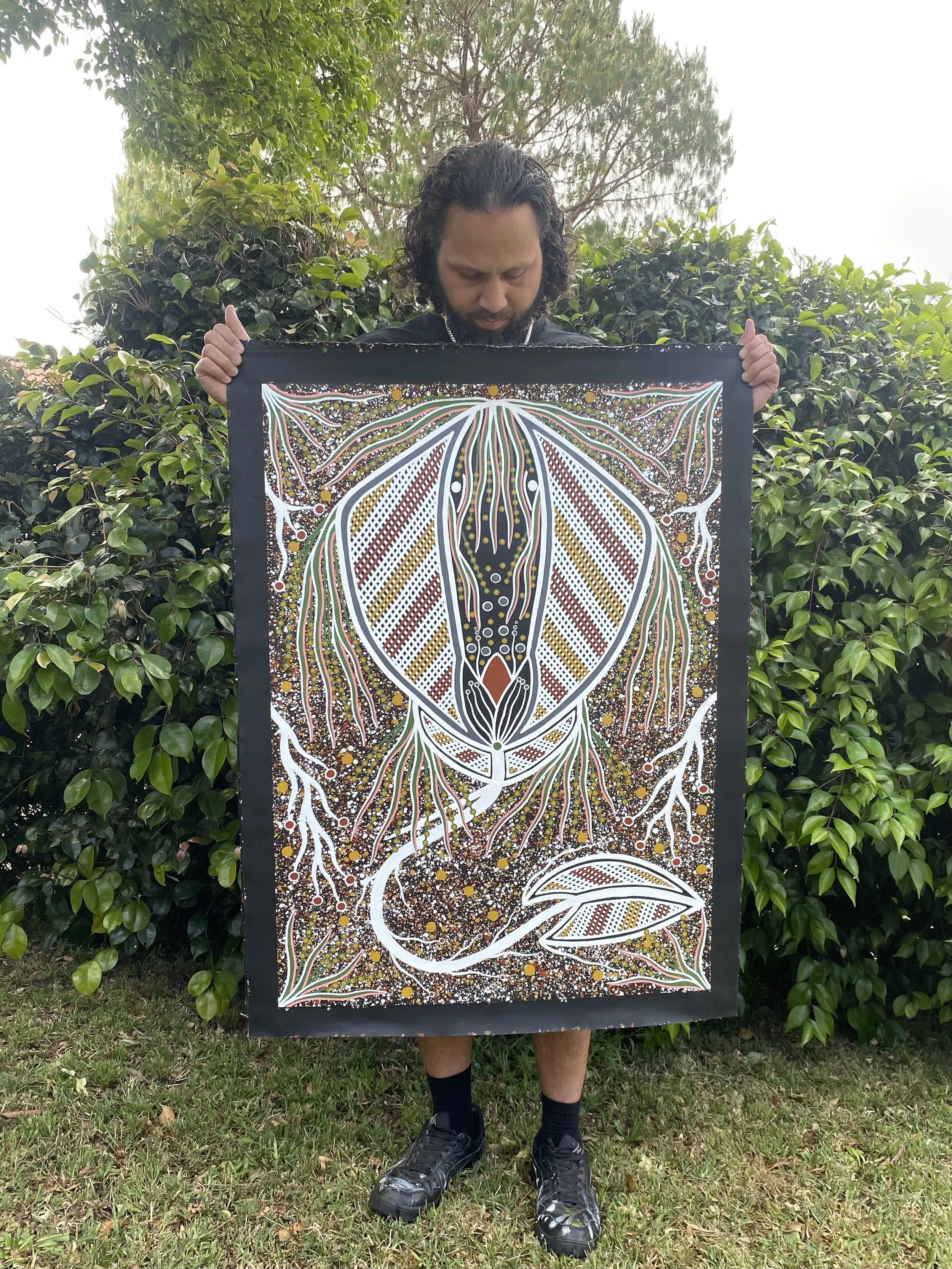 Description: The artist is paying respect to the Stingray and the spirit of our ancestors. The artist was visited by the Stingray when fishing with his children and family in an area local to the artist. He was teaching the children how to prepare and cook the fish on the beach.